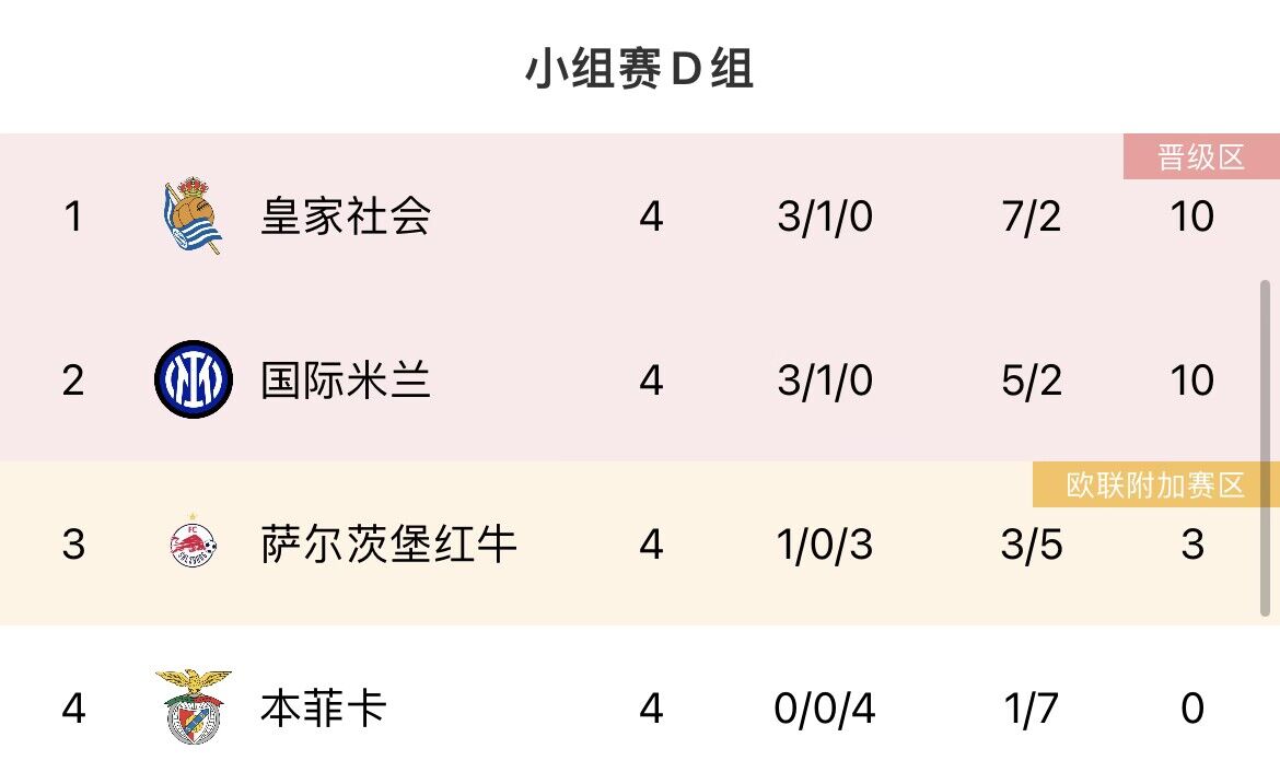 皇家社会与国米同积10分携手出线。